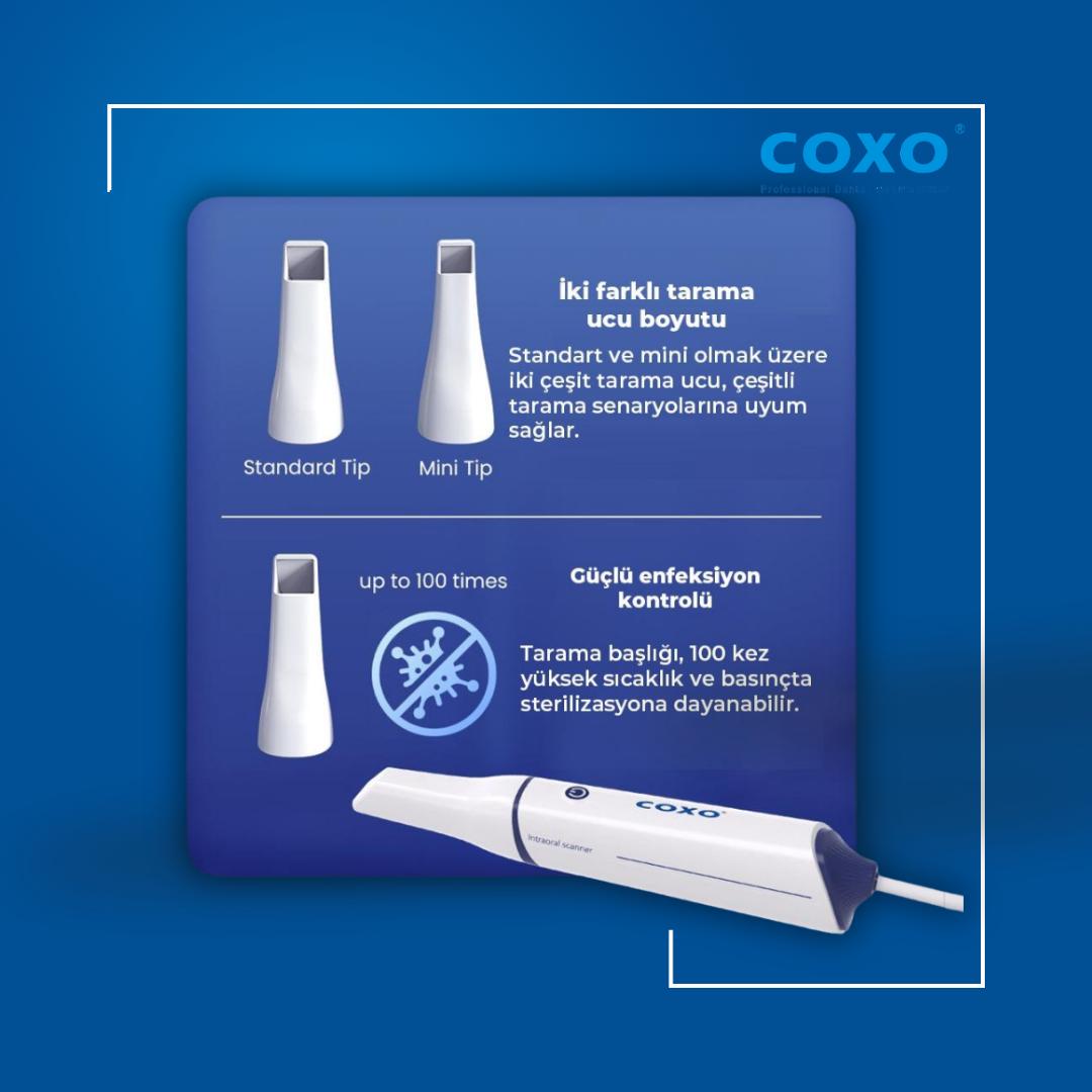 COXO ağız içi tarayıcı’nın tarama başlıkları, yüksek sıcaklık ve basınçta 100 kez sterilizasyona dayanabilir, bu da enfeksiyon kontrolü açısından önemli bir avantajdır. Standart ve mini olmak üzere iki farklı tarama ucu seçeneği, kullanım esnekliği sağlar.
