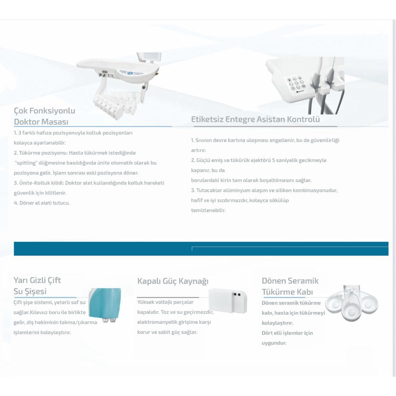 Ünitenin su sistemi sterilizasyon açısından güvenli mi?Evet. Çift şişe sistemi saf su sağlar ve bakteri oluşumunu önlemek üzere özel filtrelerle desteklenmiştir.