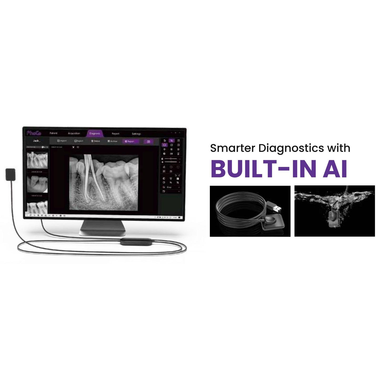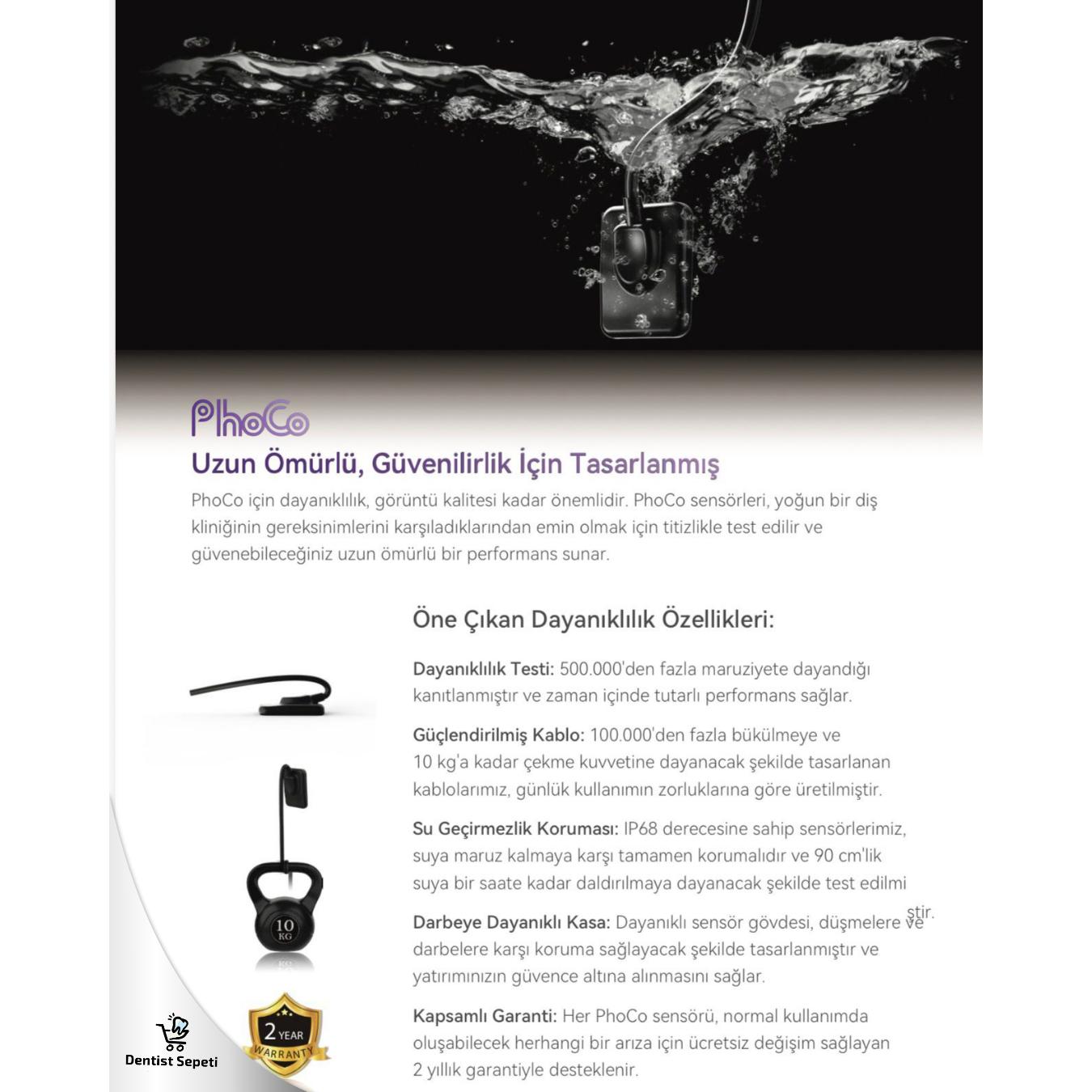 Phoco RVG Sensörü: 12-14 lp/mm çözünürlük, IP68 su geçirmezlik ve 500.000+ çekim ömrü. Ultra ince tasarımıyla en yüksek hasta konforu.